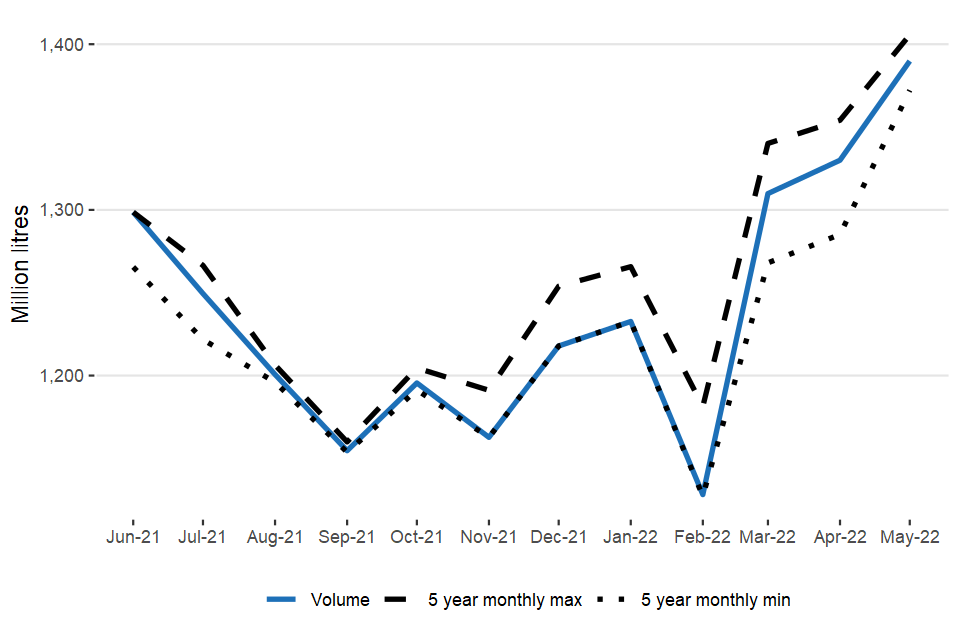 May volumes are 1,390 million litres, up 4.5% on April 2022 and 1.1% lower than May 2021. (Figure 1.4).
