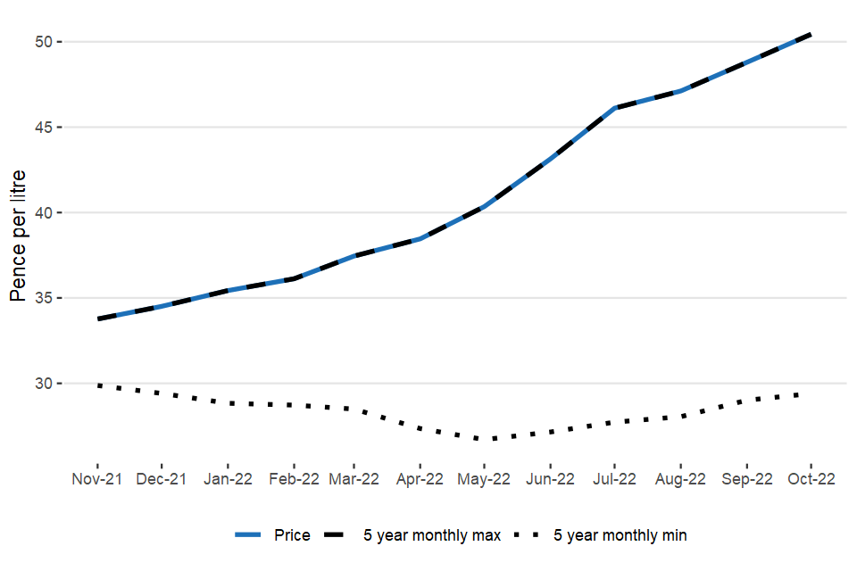 The UK average farm-gate milk price for October 2022 is 50.44 pence per litre (ppl). This represents a 3.4% (1.64 ppl) increase on September 2022 and a 54% increase on the same month last year. (Figure 1.2).
