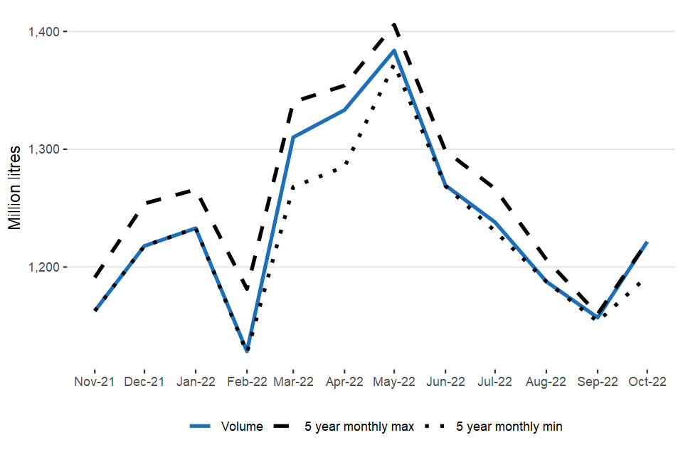 October volumes are 1,222 million litres, up 5.6% on September 2022 and 2.2% higher than October 2021. (Figure 1.4).