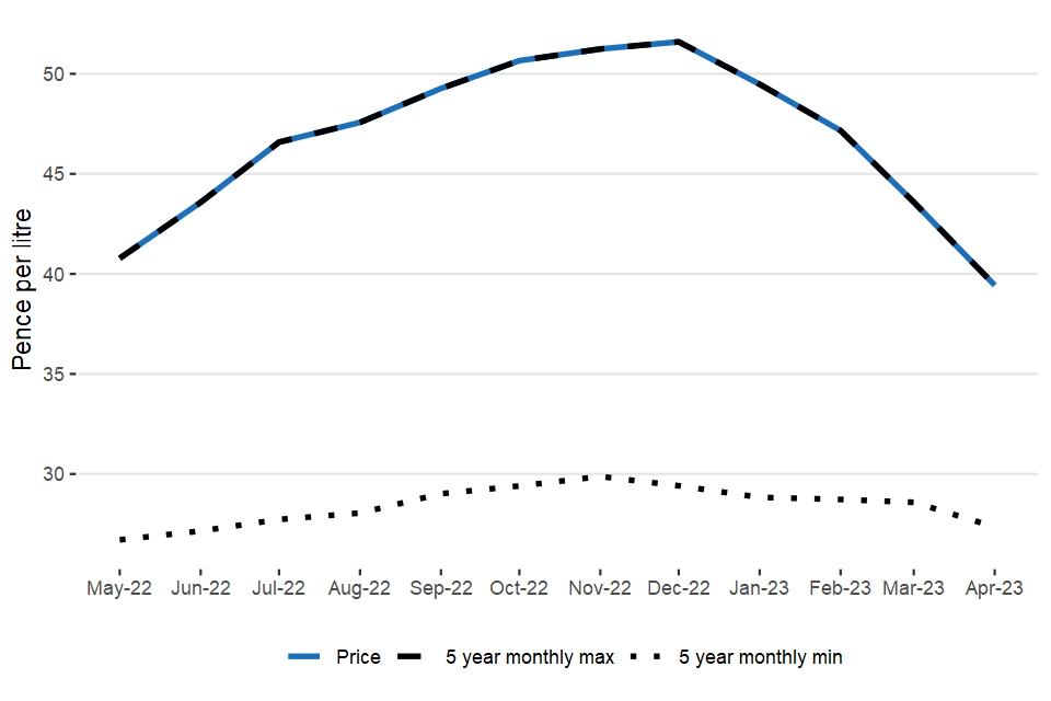 The UK average farm-gate milk price for April 2023 is 39.43 pence per litre (ppl). This represents a 9.5% (4.15ppl) decrease on March 2023 and a 2.2% increase on the same month last year. (Figure 1.2).