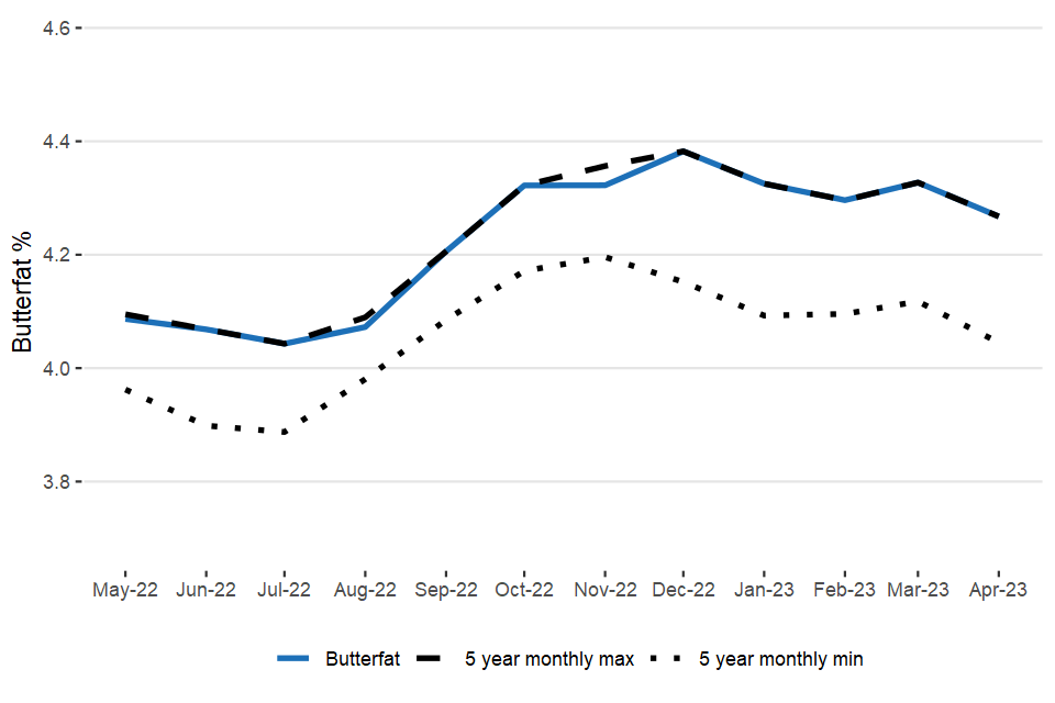 Butterfat decreased 1.4% from last month at 4.27%. Compared to last year, butterfat is 2.1% higher than April 2022. (Figures 1.3a).