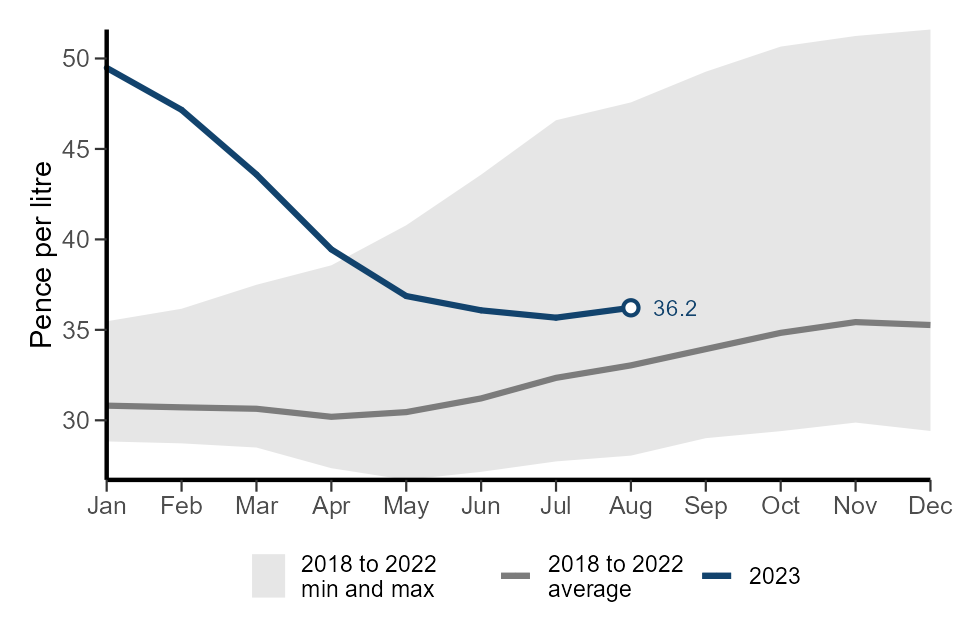 The UK average farm-gate milk price for August 2023 is 36.22 pence per litre (ppl). This represents a 1.5% (0.55 ppl) increase on July 2023 and a 24% decrease on the same month last year. (Figure 1.2).