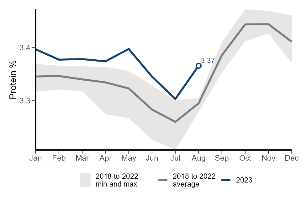 Protein increased 1.9% from last month at 3.37%. Compared to last year, protein is 1.8% higher than August 2022. (Figures 1.3b).