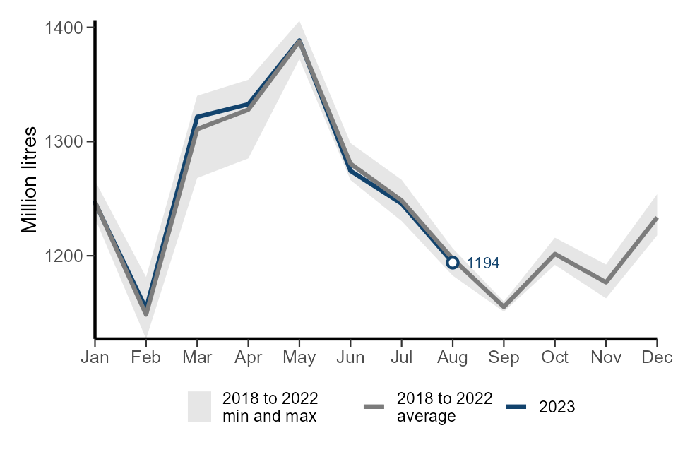August volumes are 1,193 million litres, down 4.2% on July 2023 and 1.0% higher than August 2022. (Figure 1.4).