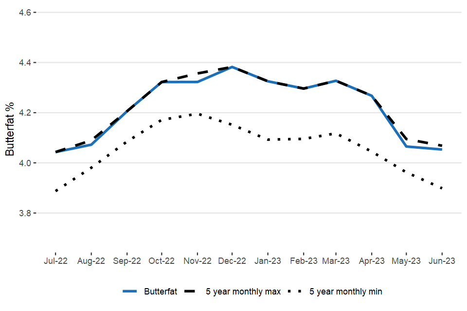Butterfat decreased 0.3% from last month at 4.05%. Compared to last year, butterfat is 0.4% lower than June 2022. (Figures 1.3a).