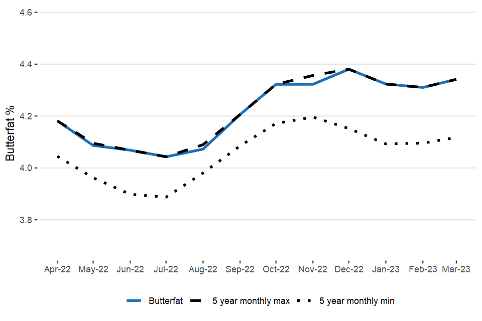 Butterfat increased 0.7% from last month at 4.34%. Compared to last year, butterfat is 1.5% higher than March 2022. (Figures 1.3a).