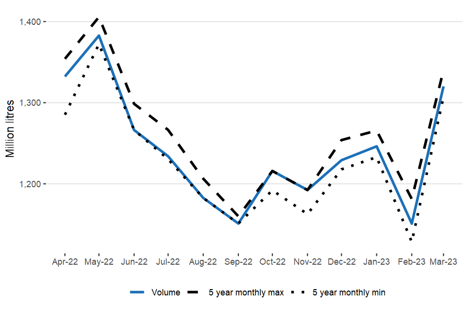 March volumes are 1,320 million litres, up 15% on Febraury 2023 and 0.8% higher than March 2022. (Figure 1.4).