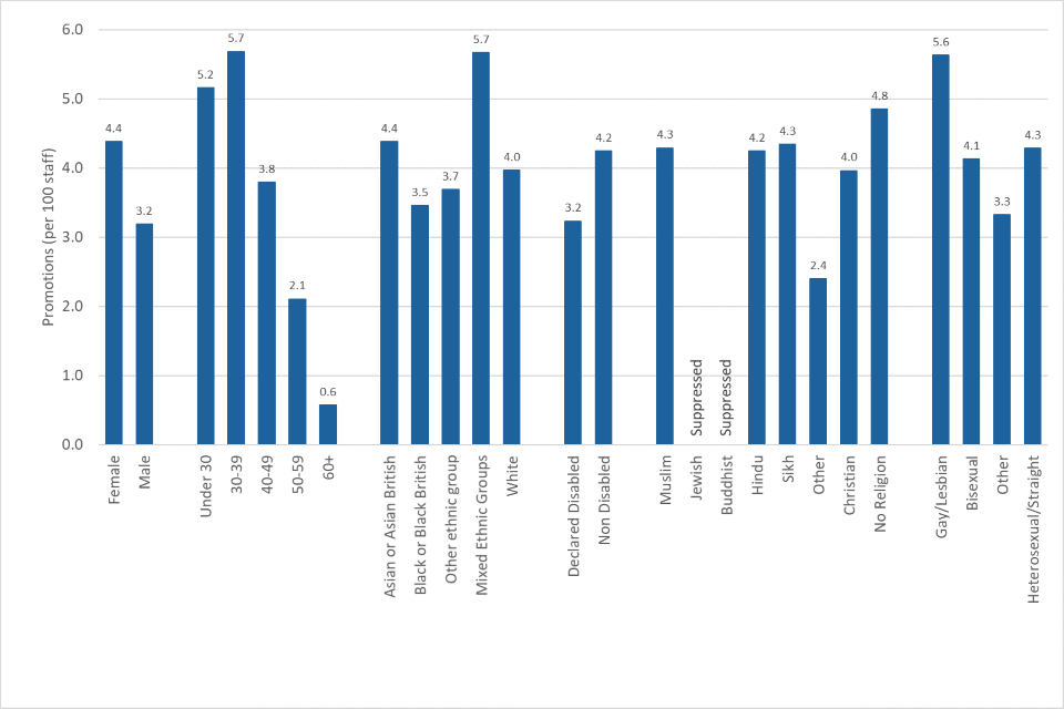 The rate of promotions, which represents the number of individuals promoted per 100 staff, in 2020/21 across all protected characteristics is illustrated in figure 4. Additional details on promotions can also be found in tables 4a and 4b.