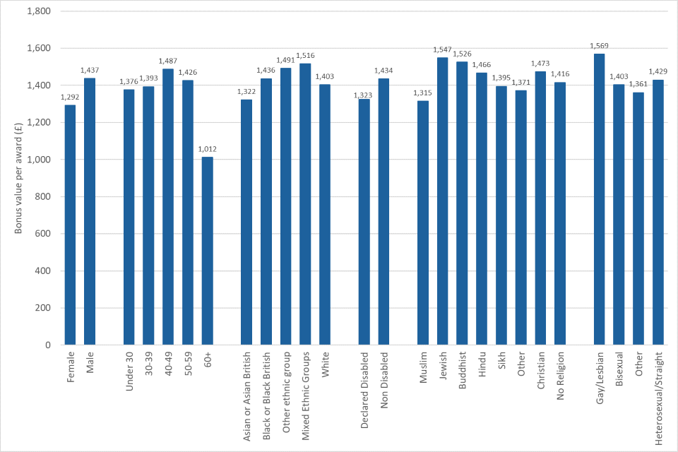 The average value per award across protected characteristics are illustrated in figures 5 below, and bonus statistics can be viewed in tables 6a, 6b(i) and 6b(ii).