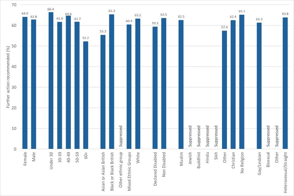 Figures 8 and 9 show the rates per 100 staff who were investigated in 2020/21 and the proportion of cases where further action was recommended, split by protected characteristic.