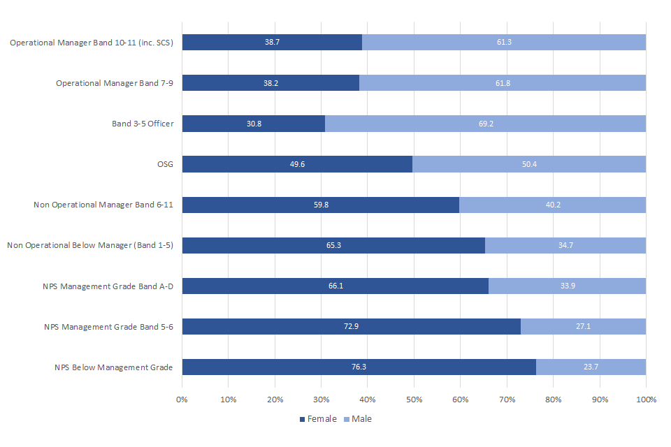 Figure 1 shows a breakdown of grades by gender, and figures 2 and 3 show the make-up of the workforce across the available protected characteristics. Representation rates are only illustrated where information is recorded for over 60% of staff. Additional details on staff in post can also be found in tables 1a and 1b.