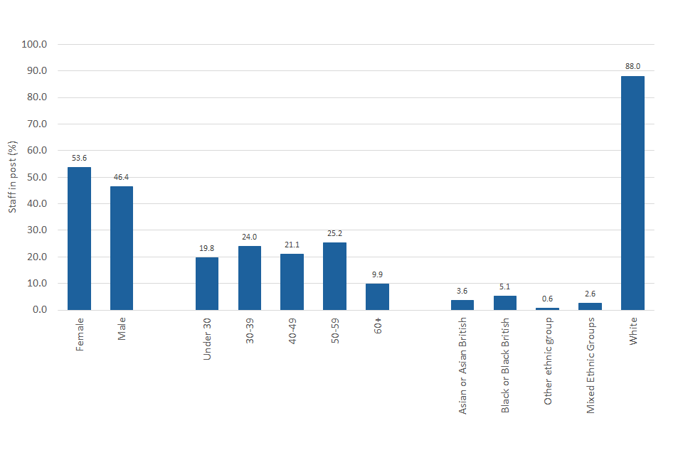 There were 62,015 staff in post as at 31st March 2022, 14.2% more than at the same date in 2021. Females accounted for 53.6% of staff (an increase of 3.6 percentage points since last year) and 12.0% of staff who declared their ethnicity were from ethnic minority backgrounds; which was an increase of 1.1 percentage points since last year. The age band with the largest proportion of staff was 50-59 year olds (25.2%).