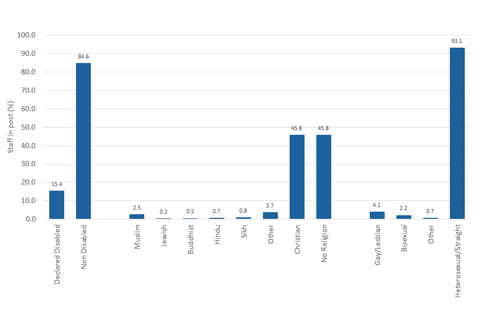 Data on the protected characteristics ethnicity, disability, sexual orientation, and religion/belief were collected from self-declared, non-compulsory fields on the Human Resources Management System (HRMS) until December 2016 and from the Single Operating Platform (SOP) from January 2017 onwards. With lower declaration rates, the risk of bias increases, and the accuracy of a representation rate based on known declarations falls rapidly. Consequently, when a declaration rate falls below 60%, no representation rate is provided.