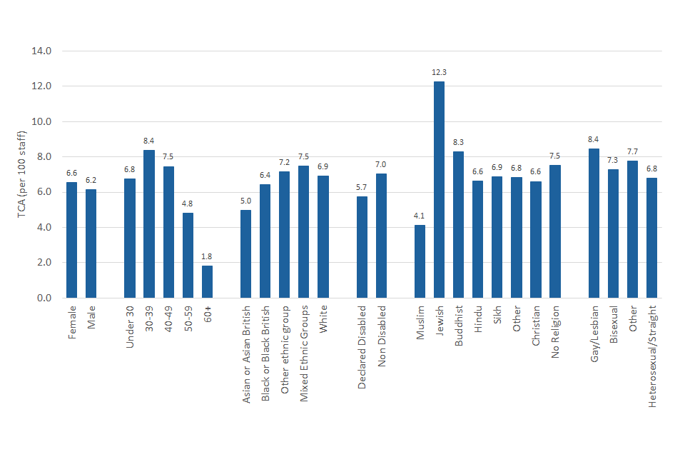 As at 31 March 2022, 3,576 staff (6.4%) were receiving temporary cover allowances (TCA). TCA rates were higher for females, those aged 30-39 years old, mixed ethnicity staff, non-disabled staff, and non-religious staff.