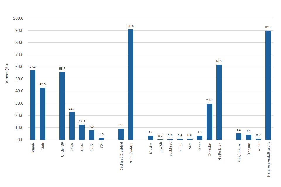 The number of staff appointed to HMPPS increased from 5,803 in 2020/21 to 8,158 in 2021/22, a 40.6% increase. The largest group of recruits were band 3 to 5 officers, with 3,845 appointed in the 12 months to 31 March 2022. Figure 2 shows a breakdown of joiners across the available protected characteristics; additional details can also be found in the tables 2a and 2b.
