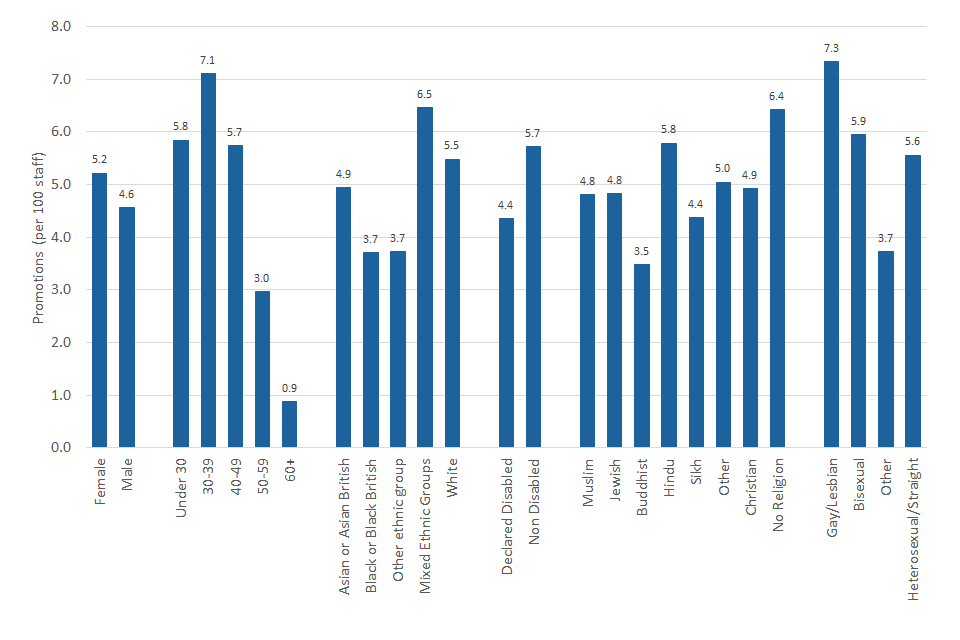 In 2021/22, 4.9% of permanent staff were promoted, an equivalent of 2,933 promotions. The rate of promotions was higher for: females, those aged 30-39 years old, mixed ethnic groups, non-disabled, non-religious staff and staff who identified as gay or lesbian.