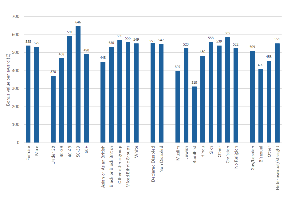 The average value per award across protected characteristics are illustrated in figures 5 below, and bonus statistics can be viewed in tables 6a, 6b(i) and 6b(ii).