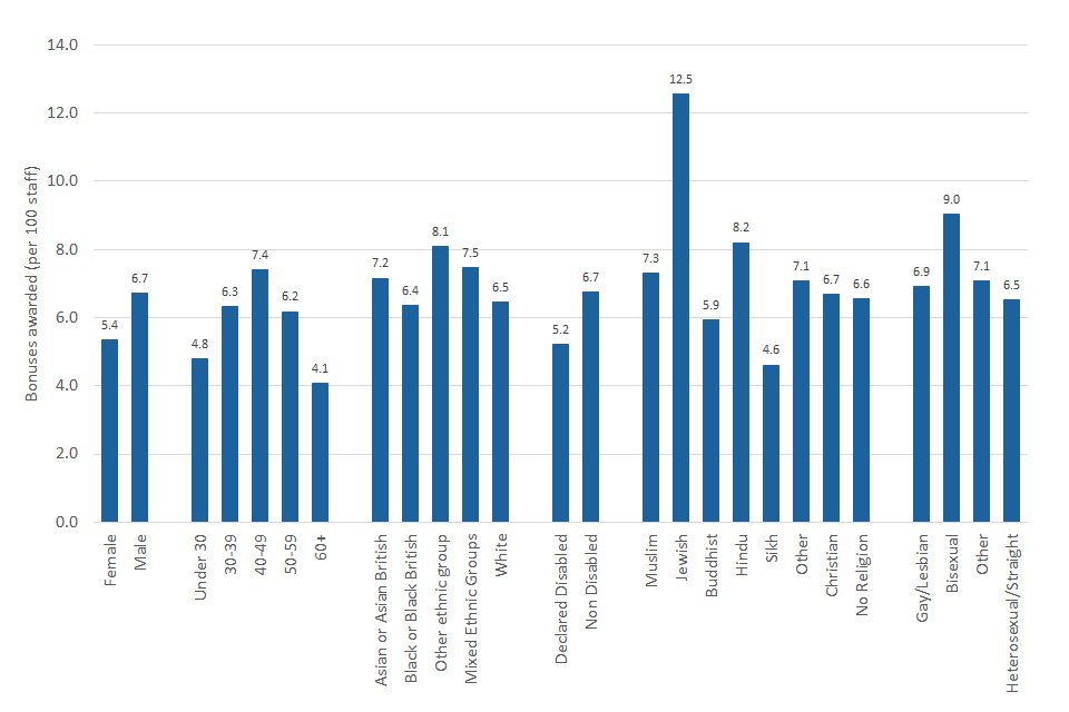 In 2021/22, the rate of bonuses awarded to those who declared as being affiliated with non-Christian religions (7.1 per 100 staff) was higher compared to those who declared as Christian (6.7 per 100 staff) and those with no religion (6.6 per 100 staff). Staff who declared themselves as LGBT (Lesbian, Gay, Bisexual and Other) were awarded bonuses at a higher rate than heterosexual staff (7.6 per 100 staff compared to 6.5 per 100 staff). However, LGBT staff were awarded a lower average value of the awards (£468) compared to heterosexual/straight staff (£551).