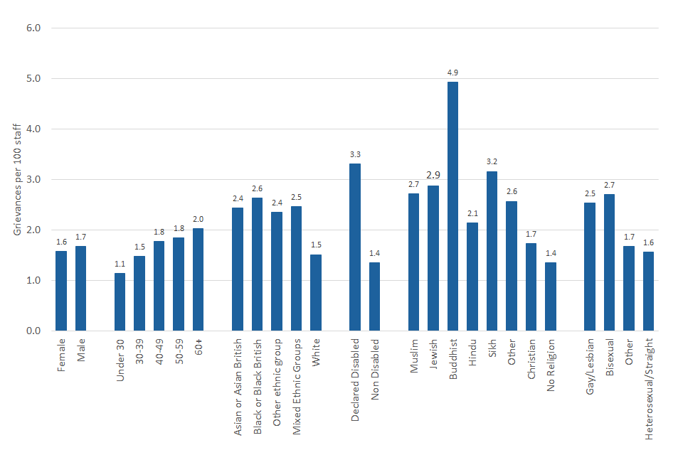 Overall, self-declared disabled staff raised more grievances, at a rate of 3.3 per 100 staff, than non-disabled staff, at 1.4 per 100 staff. Considering grades where numbers are large enough to disclose, this pattern was seen across all grades.