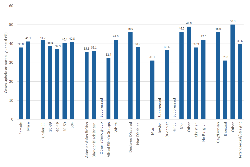 Staff who identified themselves as LGBT raised more grievances, at a rate of 2.5 per 100 staff, compared to heterosexual staff, as at a rate of 1.6 per 100 staff. The percentage of cases upheld or partially upheld was lower for heterosexual staff at 39.6% compared to LGBT staff at 41.2%.