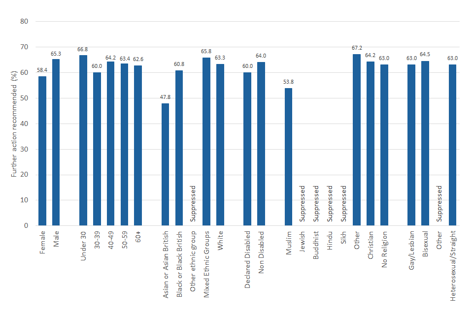 In 2021/22, the proportion of staff with non-Christian religious beliefs investigated was higher than for Christian staff, at 3.2 per 100 staff compared to 2.6 per 100 staff, respectively. Non-Christian staff had a lower proportion of cases with further action recommended (59.5%) compared to Christian staff or those with no religion (64.2% and 63.0% respectively).