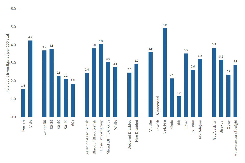 In 2021/22, the overall rate of investigated staff was 2.8 per 100 staff, a decrease from 3.4 per 100 staff in 2020/21 The rate was higher amongst; male staff (4.2 per 100 males) compared to female staff (1.6 per 100 females), Black, Asian and minority ethnic staff (3.2 per 100 staff) compared to White staff (2.8 per 100 staff), and those under 30 (3.7 per 100 staff) compared to staff in other age bands.