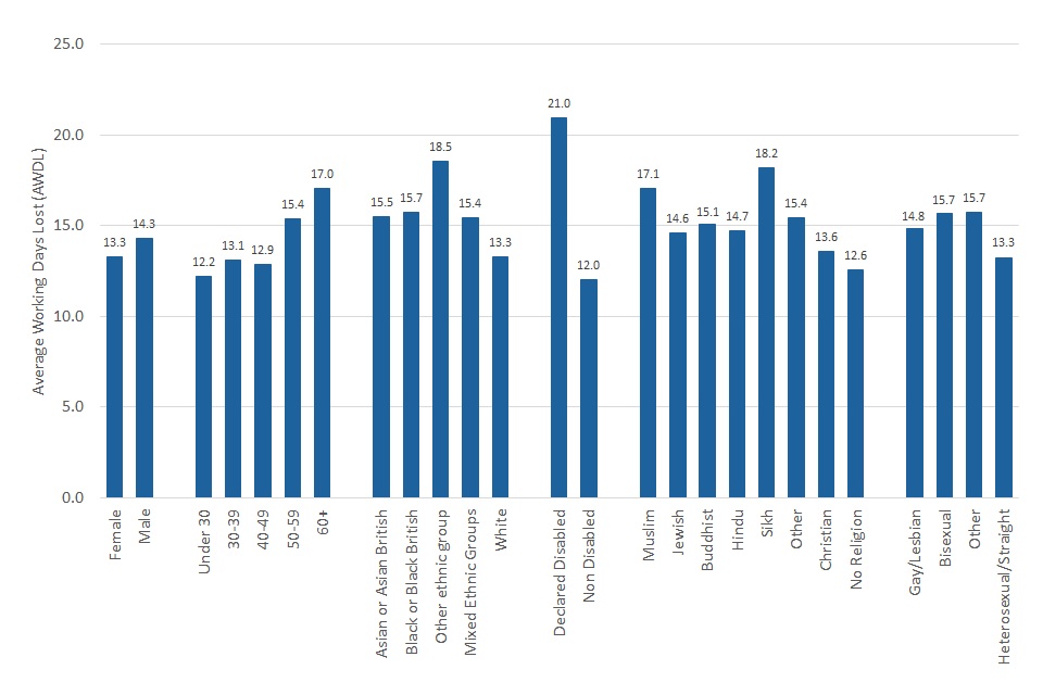 Figure 15 illustrates the AWDL in 2021/22 across all protected characteristics. Further details on sickness absence can be found in tables 10a and 10b.