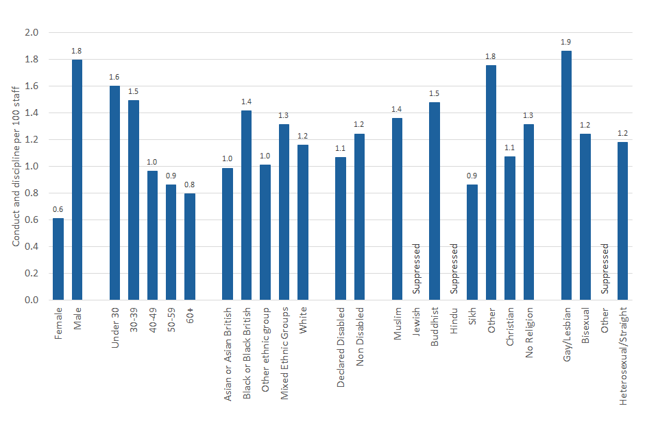 In 2021/22, the overall rate of conduct and discipline cases was 1.2 per 100 staff, a decrease from 1.5 per 100 staff in 2020/21 The rate was three times higher for male staff (1.8 per 100 male staff) compared to female staff (0.6 per 100 female staff). Black, Asian and minority ethnic staff and White staff had the same rate of conduct & discipline cases (1.2 per 100 staff).