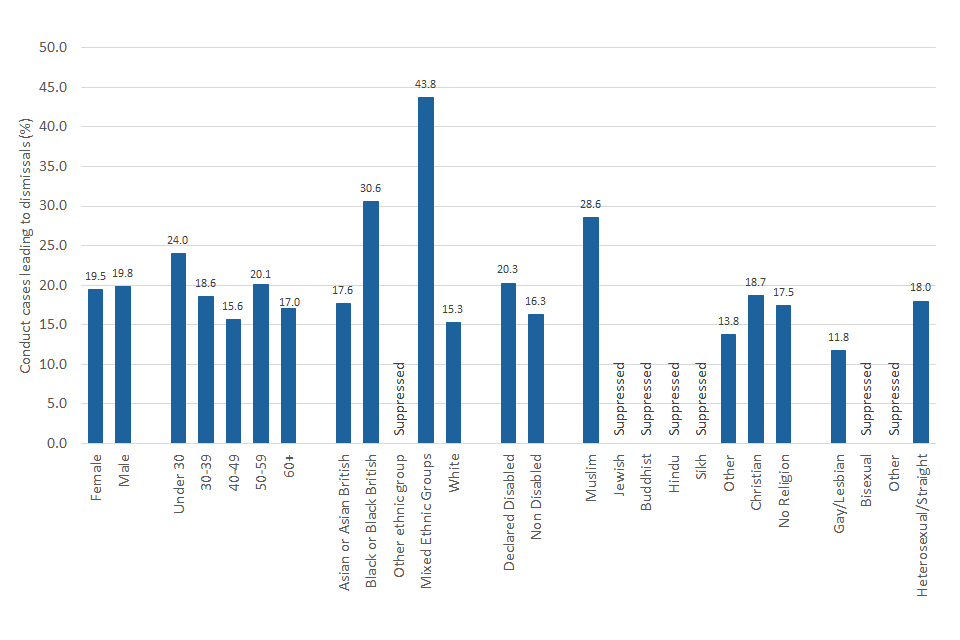 In 2021/22, ethnic minority staff and white staff had the same rate of staff subject to conduct and discipline action per 100 staff with 1.2 per 100 staff, respectively. The percentage of dismissals resulting from conduct cases was higher for ethnic minority staff at 30.1% compared to white staff at 15.3%.