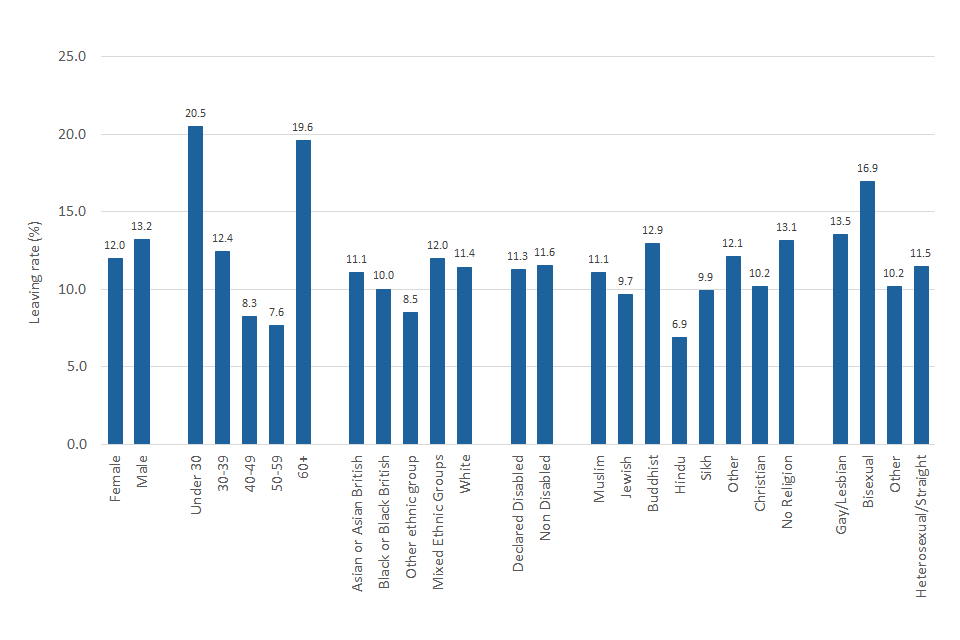 Leaving rates for each protected characteristic are shown in figure 13. Further details on leavers can be found in tables 11a to 11c.