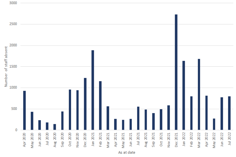 801 staff were absent due to COVID-19 sickness on 28 July 2022.