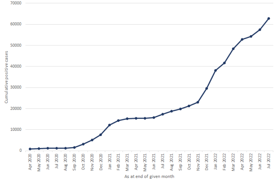 Figure 1: HMPPS staff cumulative COVID-19 positive cases, as at end of months April 2020 to July 2022