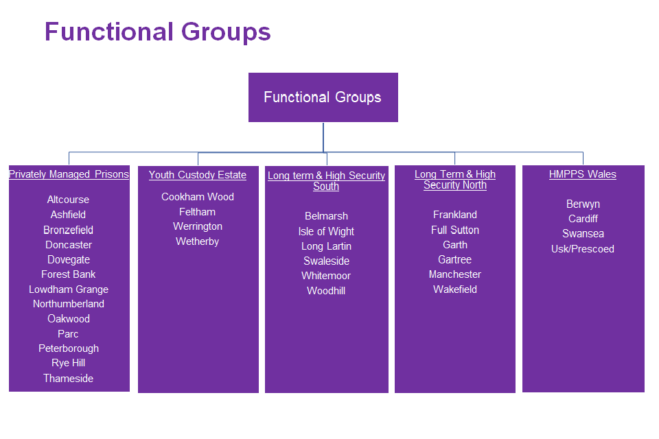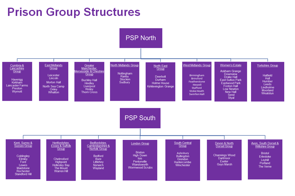 | Prison Group Directors | Senior managers responsible for the line-management of establishments organised either regionally or for Wales or for all Long Term / High Security Prisons or for the Young People’s Estate. |
