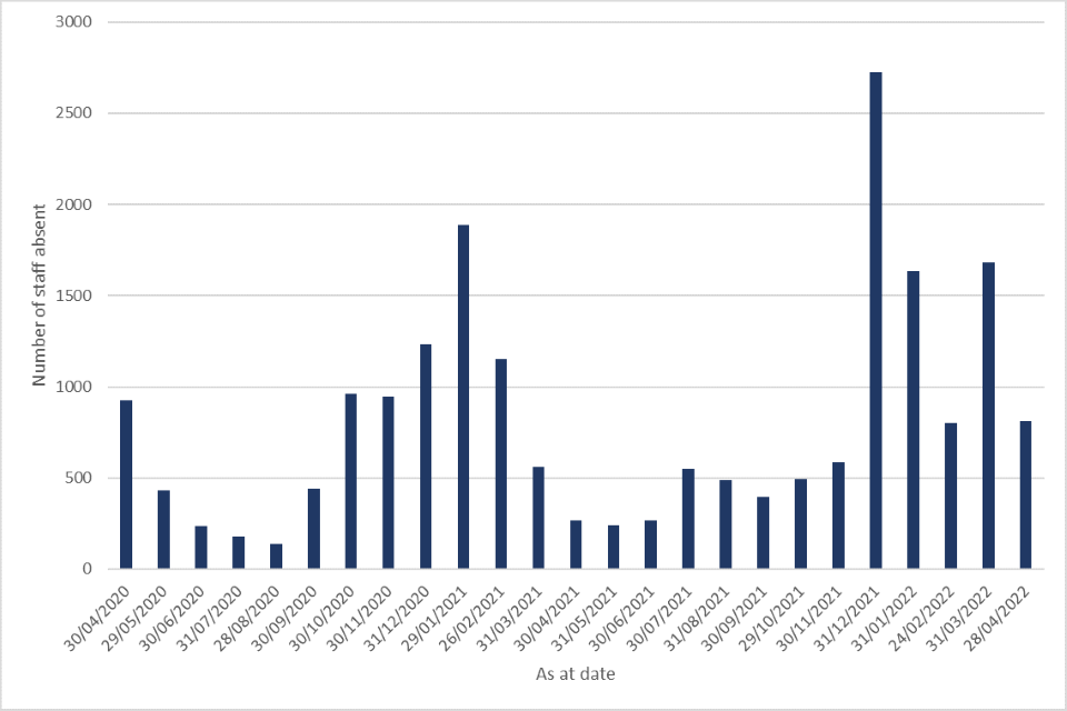 For the nine data points between 31 March 2021 and 30 November 2021, staff absent due to COVID-19 sickness have ranged between 244 and 587 before a large increase in the most recent five data points. Of the 25 dates published from April 2020 to April 2022, the highest number of staff absent due to COVID-19 sickness was recorded on 31 December 2021, when 2,728 staff were absent. On 28 April 2022, the most recent published date, there were 811 staff absent due to COVID-19 sickness. Of these staff absence cases, 748 were for directly employed staff and of these, 562 of these were staff from Prisons and Youth Custody Service.