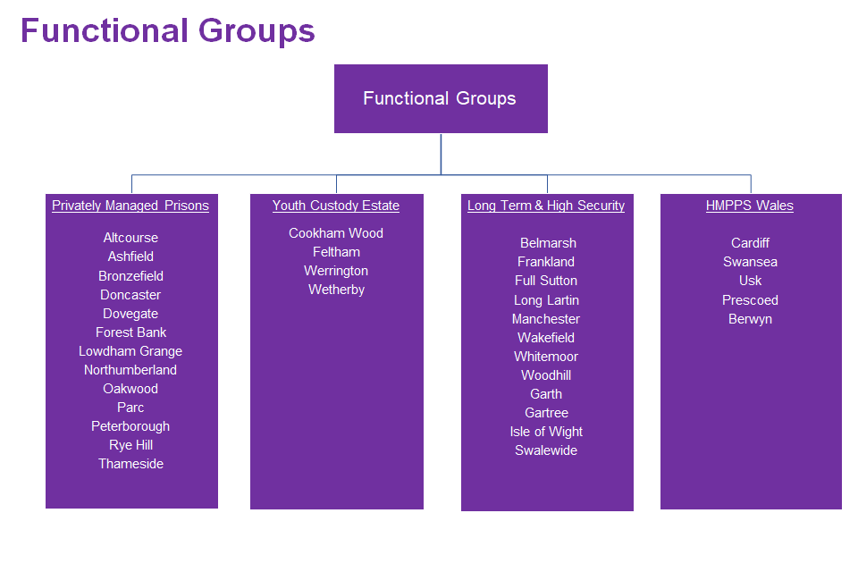 | Prison Group Directors | Senior managers responsible for the line-management of establishments organised either regionally or for Wales or for all Long Term / High Security Prisons or for the Young People’s Estate. |