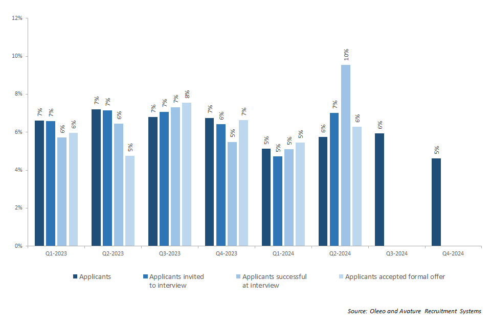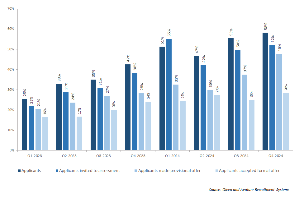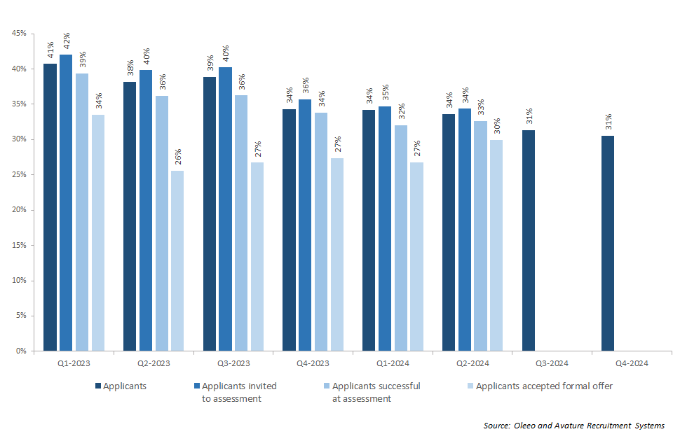 The diversity statistics in this report are based on self-declared information that applicants have provided on the Oleeo and Avature recruitment systems. Completion of the data on Oleeo is voluntary, and the information is not considered during the recruitment process. The declaration rates are typically high at above 95 per cent. Some applicants choose not to declare their ethnicity, disability status or gender, or do not complete the information – these applicants are grouped together and included in the ‘Unknown’ group. As this is not a meaningful category those who do not declare their information are not included within the analysis.