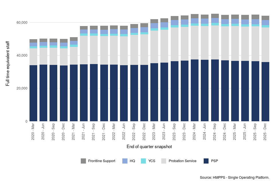 As at 31 December 2025, there were 64,114 FTE staff in post which was a decrease of 493 FTE compared to December 2024. This reduction was mainly due to decreases in Public Sector Prisons which saw a decline of 1,100 FTE (3.0%), and the Youth Custody Estate which saw a decrease of 75 FTE ( 5.4%). However, these decreases in prisons were partially offset by an increase of 451 FTE (2.2%) in the Probation Service, and 231 FTE (4.1%) in HQ and Frontline Support staff. Since 30 September 2025, there has been a decrease of 619 FTE staff in post (1.0%) across HMPPS.