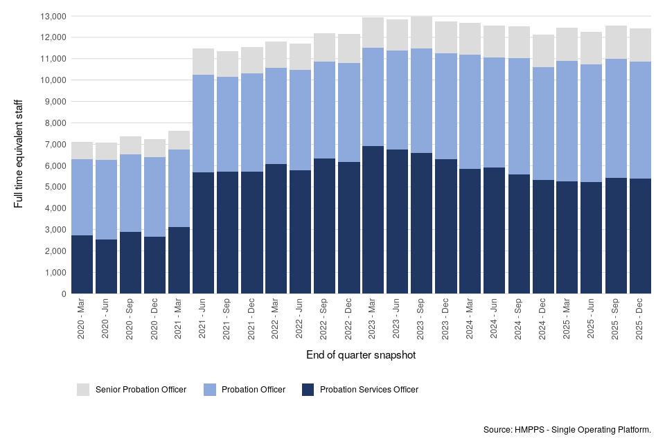 Most Probation Service grades saw an increase over the last year with there being an increase of 172 FTE (3.3%) probation officers as well as increases for other bands 4-6 (9.5%), senior probation officers (2.8%) and probation services officers (1.6%). As at 31 December 2025 5,454 FTE band 4 probation officers were in post which is a decrease of 122 FTE (2.2%) compared to September 2025. For the 2025/26 financial year, the department has committed publicly to onboarding at least 1,300 Trainee Probation Officers and will confirm whether it has met that commitment in the April 2026 transparency release.