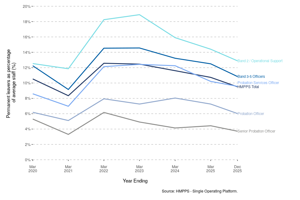 The leaving rate for staff in the Probation Service overall in the year ending 31 December 2025 was 8.5%, which is a decrease of 1.0 percentage point since the year ending 31 March 2025. In the operational grades within the Probation Service, the leaving rate was highest amongst probation services officers at 9.6%: a decrease of 0.6 percentage points from the year ending 31 March 2025. Leaving rates for probation officers and senior probation officers stood at 6.0% (a decrease of 1.2 percentage points) and 3.7% (a decrease of 0.7 percentage points), respectively, compared to the year to 31 March 2025.