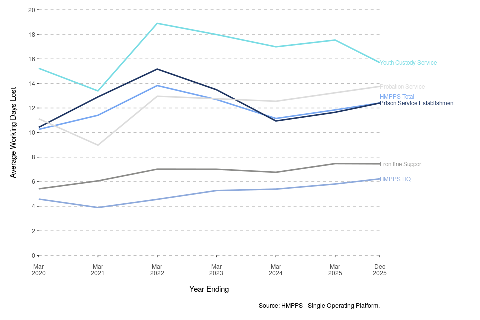 In the year ending 31 December 2025, HMPPS staff lost an average of 12.4 working days to sickness absence. This is an increase from 11.8 average working days lost for the year ending 31 March 2025, and an increase of 2.2 days compared to the predominantly COVID-19 free year ending 31 March 2020.