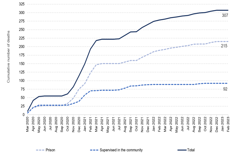 307 prisoners and supervised individuals have died having tested positive within 60 days of death or where there was a clinical assessment COVID-19 was a contributory factor in their death. Of whom 215 were prisoners and 92 were individuals supervised by the probation service. There were no deaths in February 2023. There was an historic death reported during the month. There have been no deaths of children in custody.