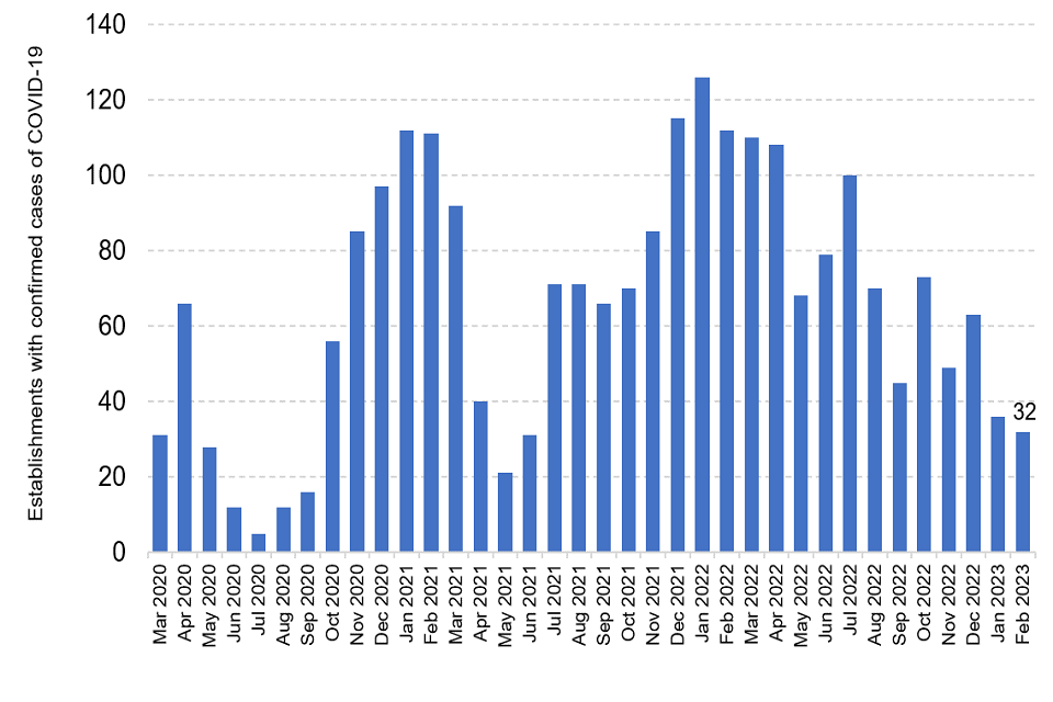32 establishments had prisoners testing positive in February 2023, a decrease of 4 compared with January 2023.
