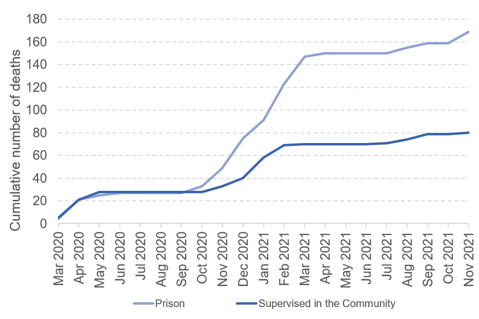 From March 2020 to the end of November 2021, 249 individuals in the care of HMPPS died having tested positive for COVID-19 within 28 days of death or where it was confirmed post-mortem as a contributing factor. 169 were prisoners. There were no deaths of children in custody. 80 of the 249 individuals were being supervised in the community[footnote 2]. Figure 1 shows the cumulative number of prisoner and supervised individual deaths since March 2020.