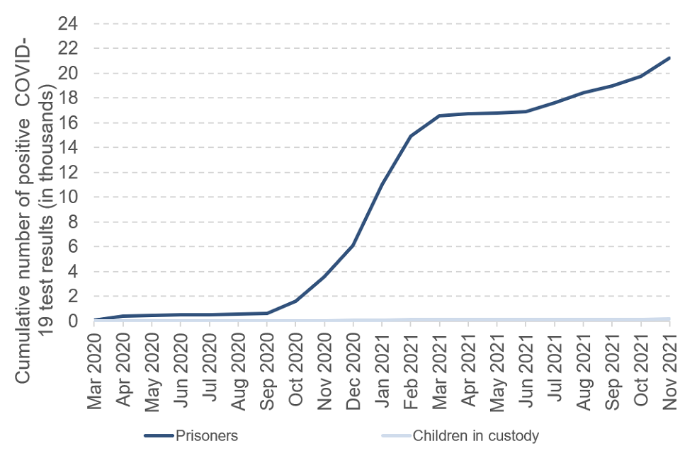 21,373 prisoners or children in custody have tested positive for COVID-19 since the start of the pandemic, across 128 establishments, almost all of whom were adults.
