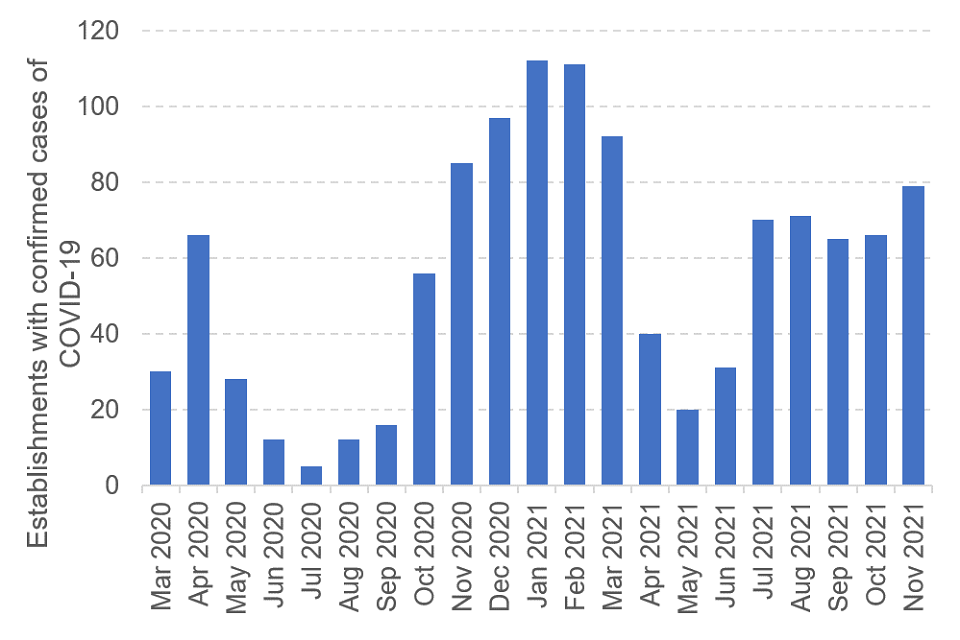 79 establishments had prisoners or children testing positive in November 2021, 13 more than October 2021.