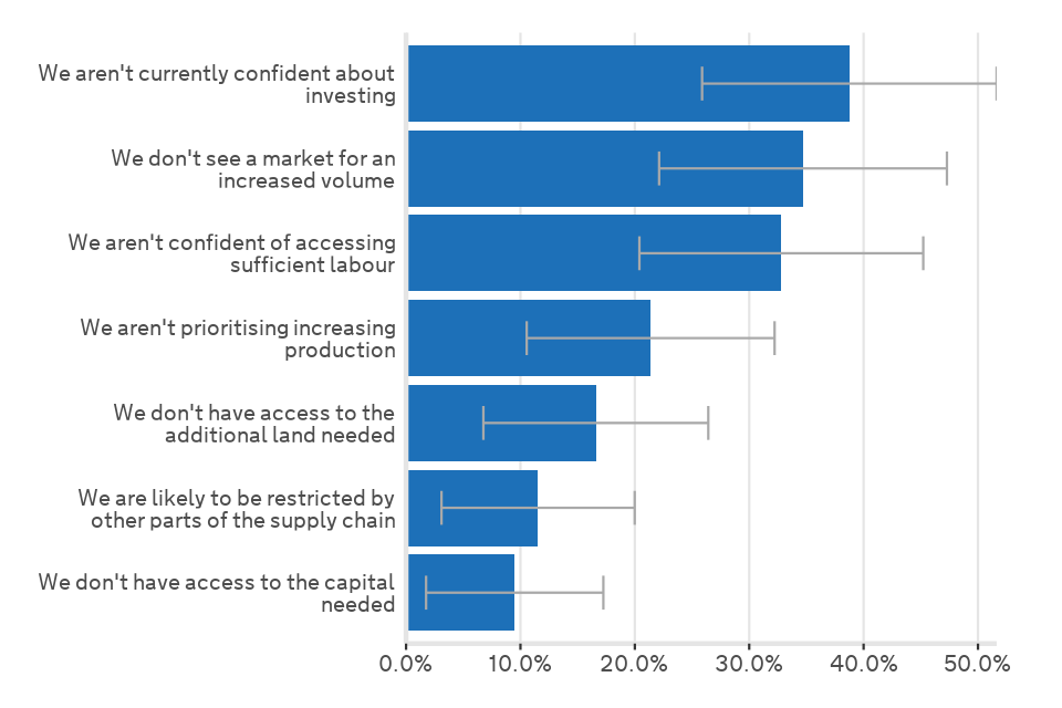 The most common reason for growers not planning to increase production is a lack of confidence in investing (39%). Input costs were the most important factor when deciding whether to increase production (followed by the availability of labour and increased consumer demand for domestic produce).