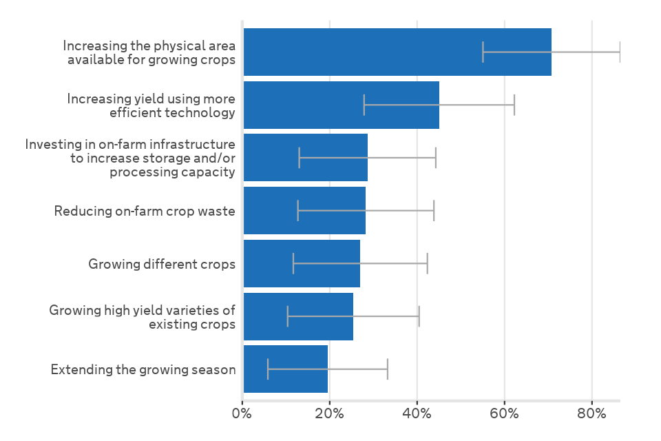 Most popular method is increasing the physical area available for crops (71%), the increasing yield using more efficient technology (45%)