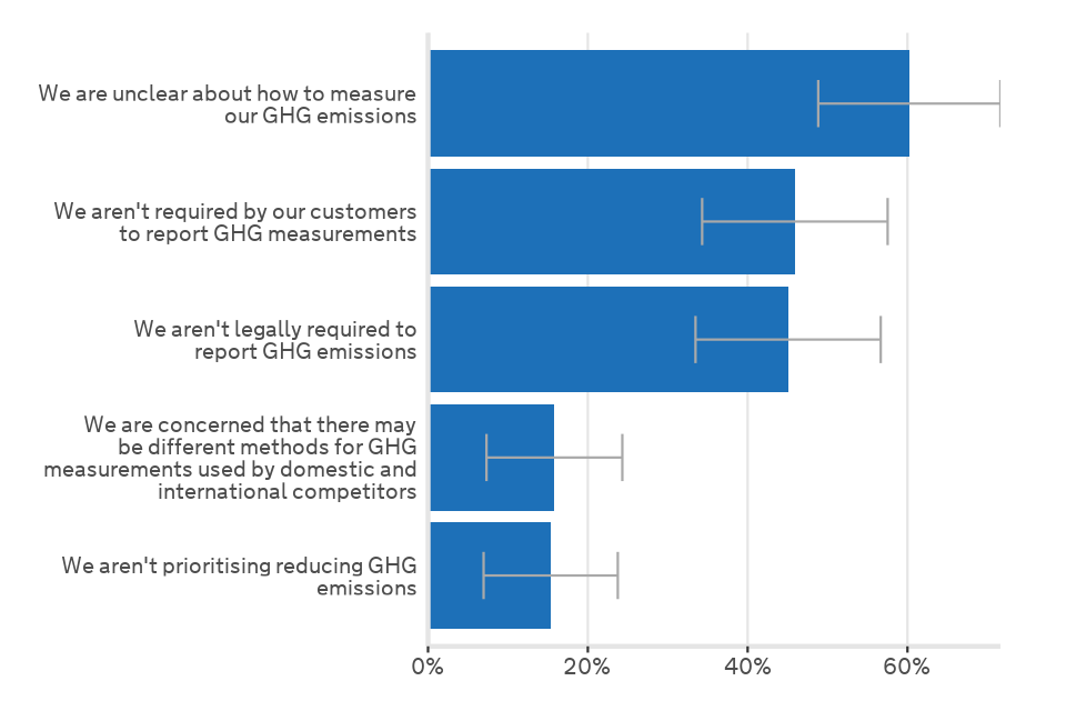 Most popular reason is being unclear how to measure GHG footprint (60%), then no requirement from customers (46%)