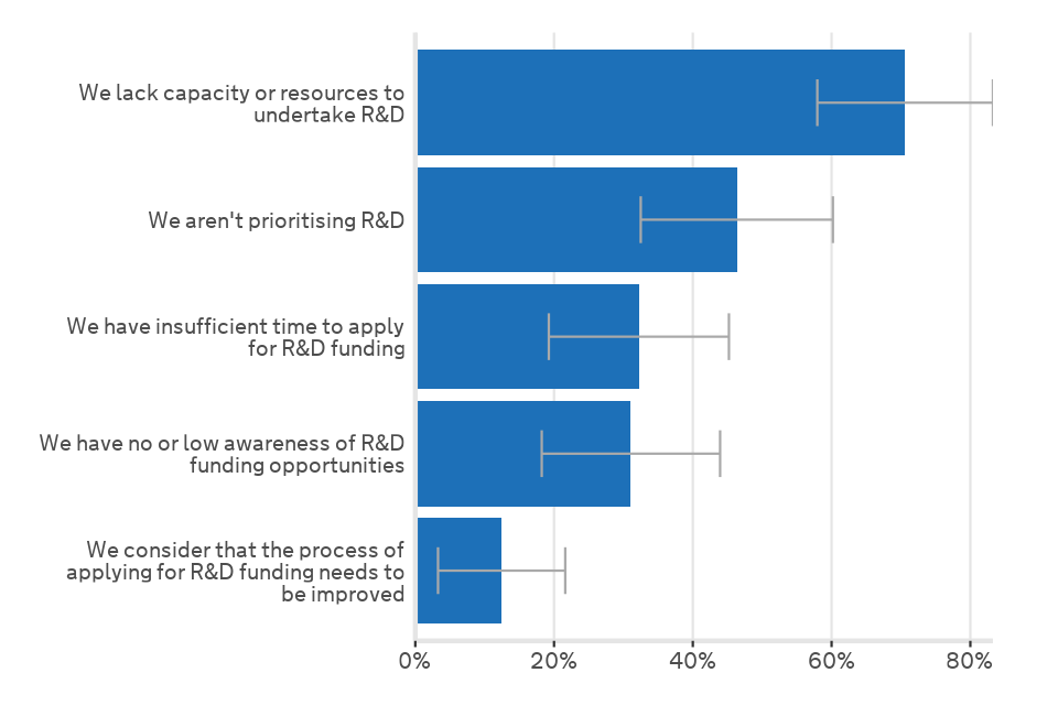 Most popular reason is a lack of capacity or resources (71%), then not prioritising R&D (46%)