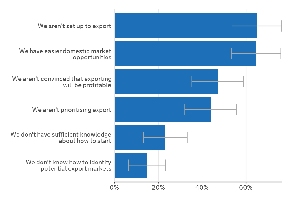 The most common reasons for not exporting are not being set up to export (65%) and having easier domestic market opportunities (65%).